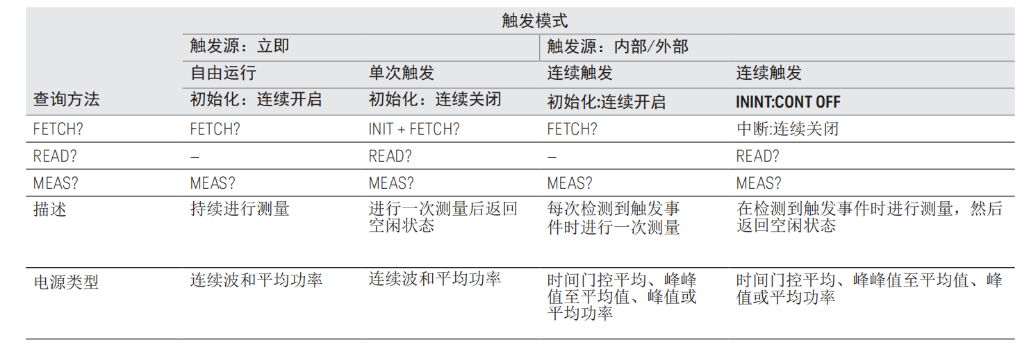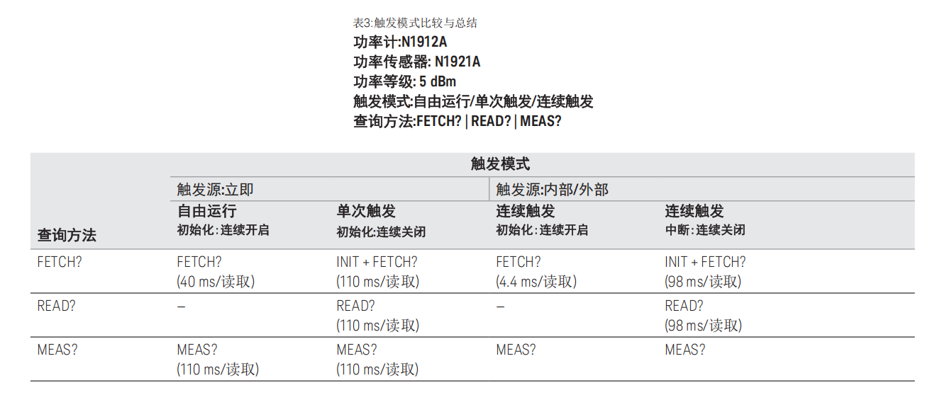 FETCH?:僅從輸出緩沖區(qū)讀取已完成測量的結(jié)果,不執(zhí)行初始化,因此速度最快,適用于高功率信號;但在低功率測量時若平均未完成,可能返回不準確數(shù)據(jù)。