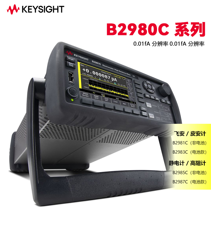 在材料科學(xué)、半導(dǎo)體測試、納米技術(shù)及高阻元件研發(fā)等領(lǐng)域,極微弱電流與超高阻值的精準(zhǔn)測量一直是技術(shù)難點(diǎn)。傳統(tǒng)數(shù)字萬用表(DMM)或普通皮安表往往無法在低至飛安(fA)級別或高達(dá)拍歐(PΩ)級別的測量中提供足夠的分辨率和穩(wěn)定性,且操作復(fù)雜、易受環(huán)境噪聲干擾。是德科技(Keysight)推出的B2980C系列飛安/皮安表與靜電計(jì)/高阻表,以其全球領(lǐng)先的0.01 fA分辨率、最高10 PΩ電阻測量能力、圖形化操作界面及多款實(shí)用附件,為科研與工程人員提供了一套可信賴的高靈敏度電學(xué)測量方案。