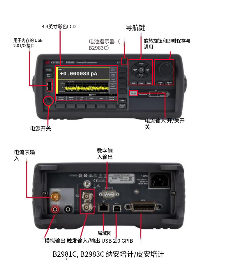 B2983C | 飛安/皮安表(電池版) | 在 B2981C 基礎(chǔ)上增加電池供電,消除交流電源線噪聲,適合超低噪聲環(huán)境 |
