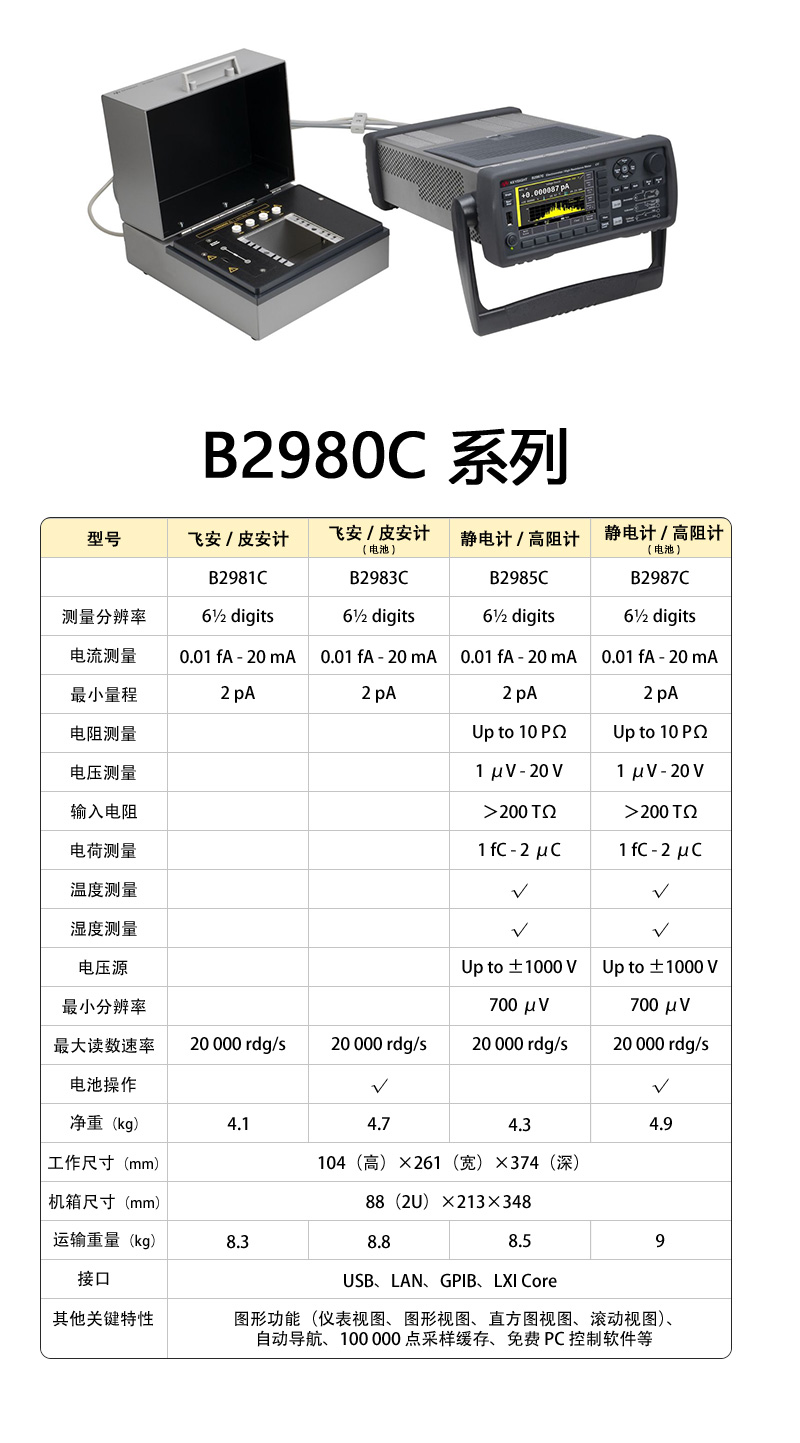 B2987C | 靜電計(jì)/高阻表(電池版) | 在 B2985C 基礎(chǔ)上增加電池供電,兼具高電壓輸出與超高阻測量能力,且完全隔離電源噪聲 |
