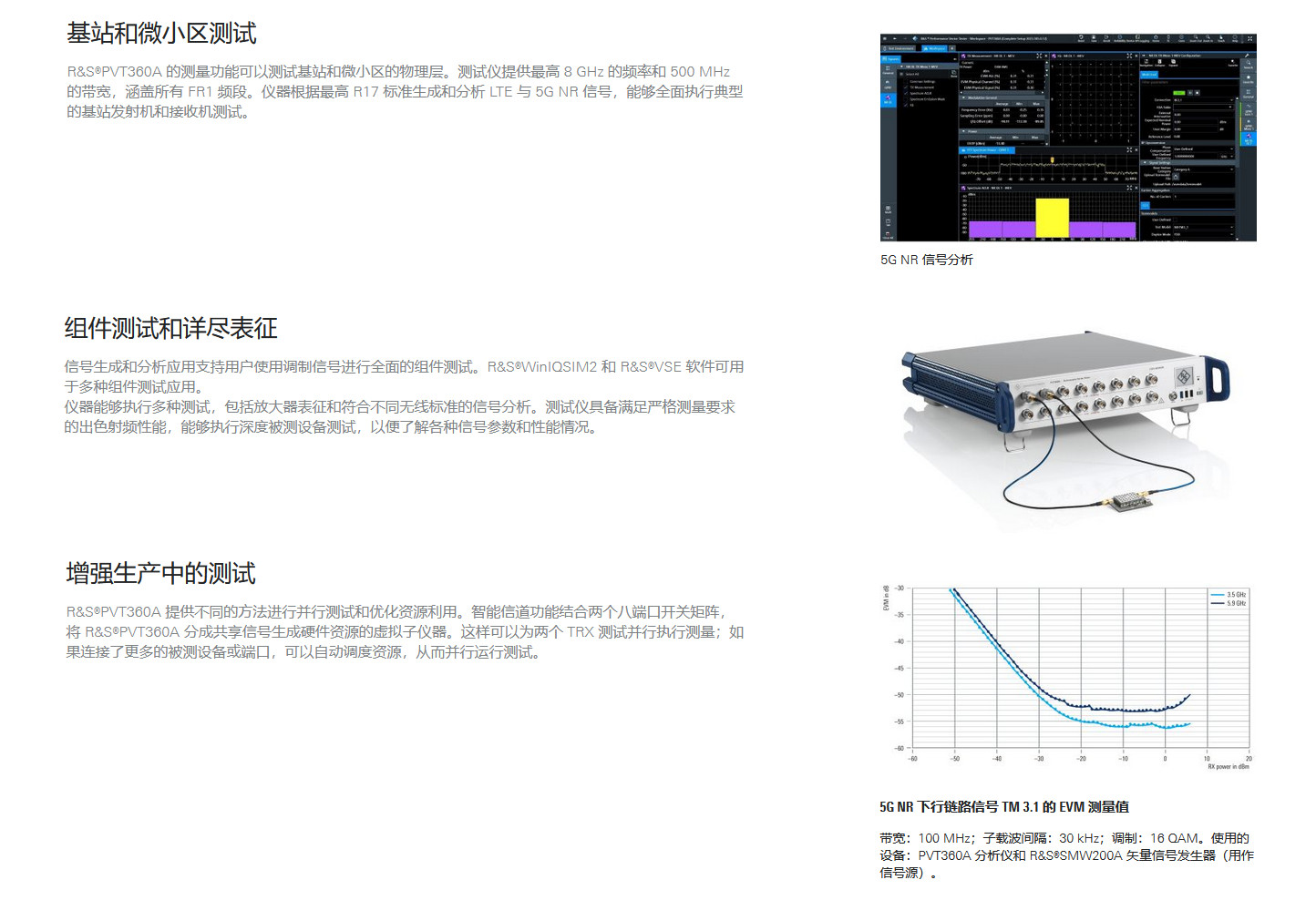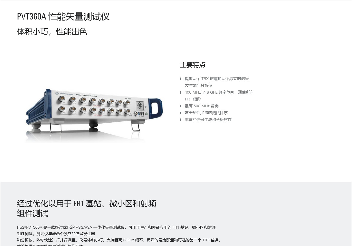 • 描述PVT360A 是一款經(jīng)過優(yōu)化的 VSG/VSA 一體化矢量測試儀,可用于生產(chǎn)和表征應(yīng)用的 FR1 基站、微小區(qū)和射頻 組件測試。測試儀集成兩個獨立的信號發(fā)生器 和分析儀,能夠快速進行并行測量。儀器體積小巧,支持最高 8 GHz 頻率、靈活的帶寬配置和可選的第二個 TRX 信道,能夠提供所需性能并靈活適應(yīng)操作環(huán)境。